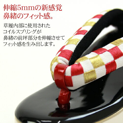 草履内部に使用された コイルスプリングが 鼻緒の前坪部分を伸縮させて フィット感を生み出します。