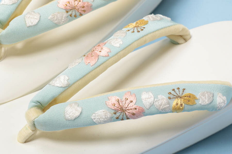 衿秀 白の台に桜の刺繍入り鼻緒付き草履 とっても綺麗なブルーに桜の刺繍がしてあります 染の着物などに履かれたらきれいです フォーマルや小紋など幅広く履いてもらえます 成人式の振袖や十三参りにもステキです。