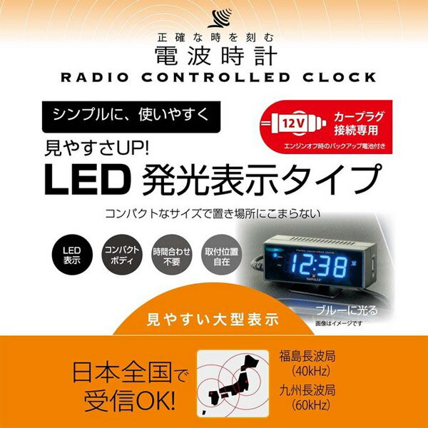LED(ブルー)採用!発光表示で視認性がバツグン! ・シガーソケットに差し込むタイプ ・カープラグ接続タイプの電波時計 ・昼間夜間視認性を持つ、LED(ブルー)を採用 ・自動受信で時刻合わせの必要がありません。