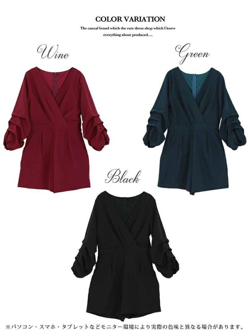あす楽 オールインワン ロンパース セットアップ レディース 秋冬 ワンピース 大人 上品 きれいめ カシュクール 七分袖 パンツ ゆったり オフィスカジュアル 大人可愛い おしゃれ ティアードスリーブ 無地 シンプル ブラック 黒 ワインレッド グリーン ブランド